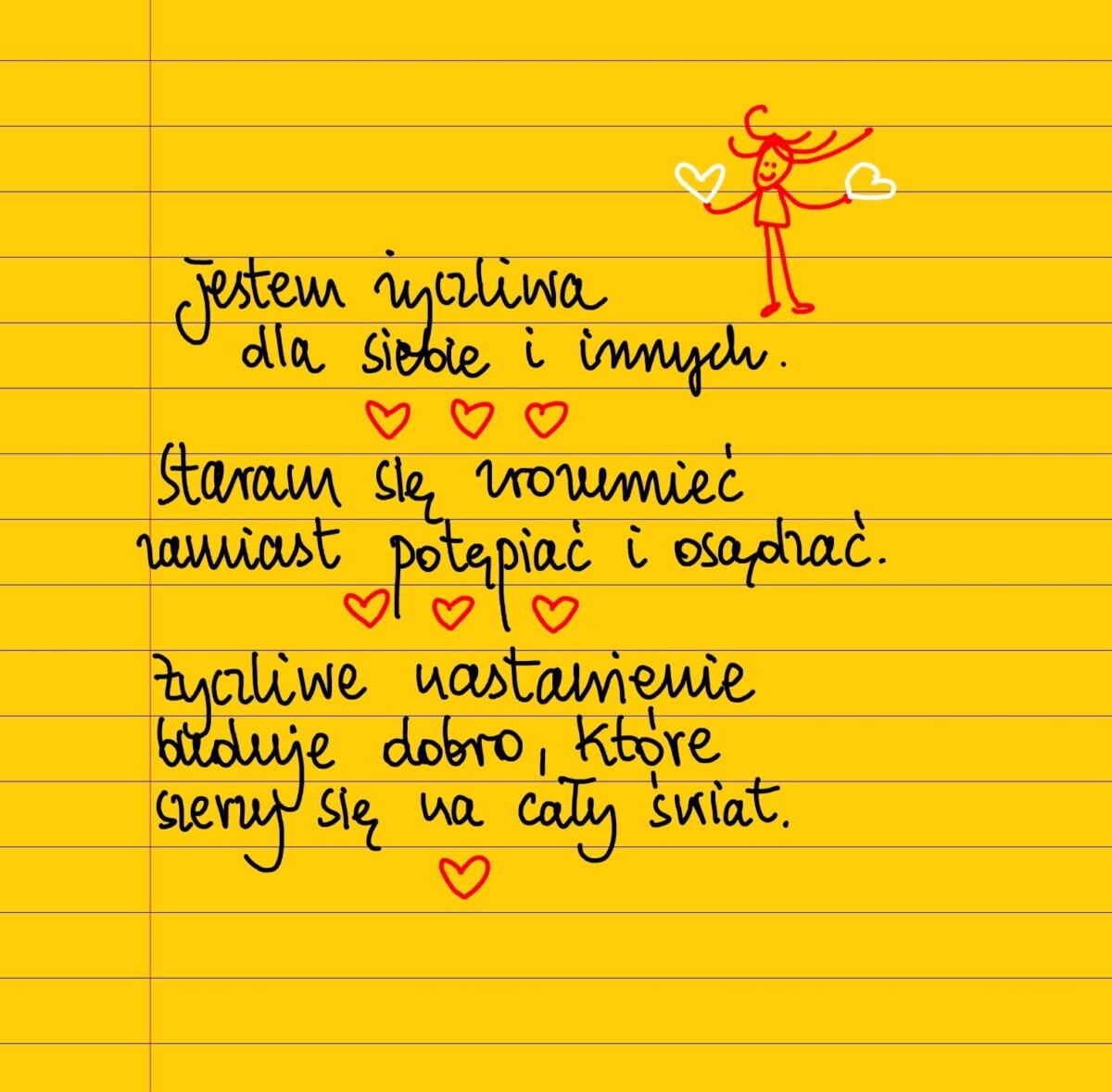 Jestem życzliwa dla siebie i innych. Staram się zrozumieć zamiast potępiać i odrzucać. Życzliwe nastawienie buduje dobro, które szerzy się na cały świat. #żółtakartka
