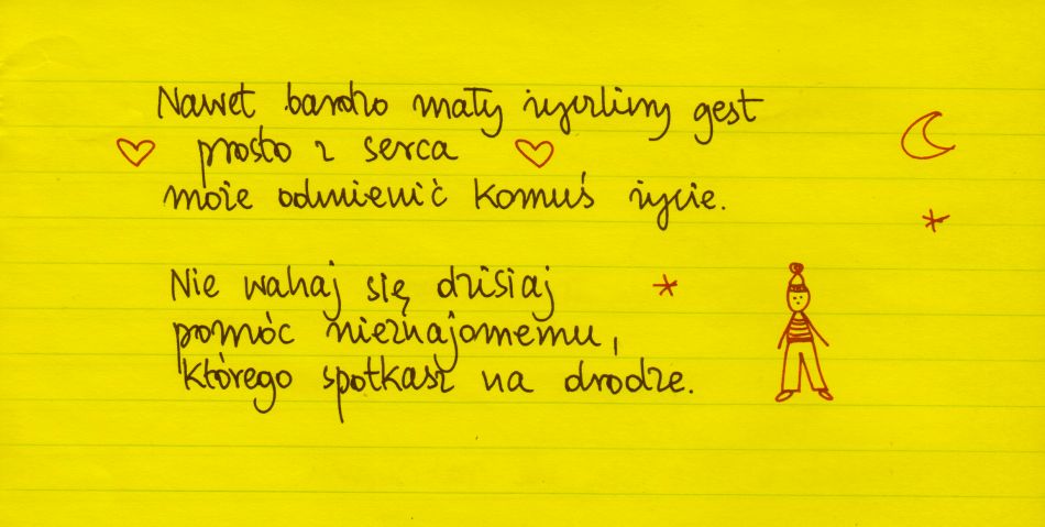 Żółte kartki Życzliwy gest prosto z serca czwartek, 30.09.2021 Nawet bardzo mały zyczliwy gest prosto z serca może odmienić komus życie. Nie wahaj się dzisiaj pomóc nieznajomemu, którego spotkasz po drodze. #żółtakartka Udostępnij na Facebooku